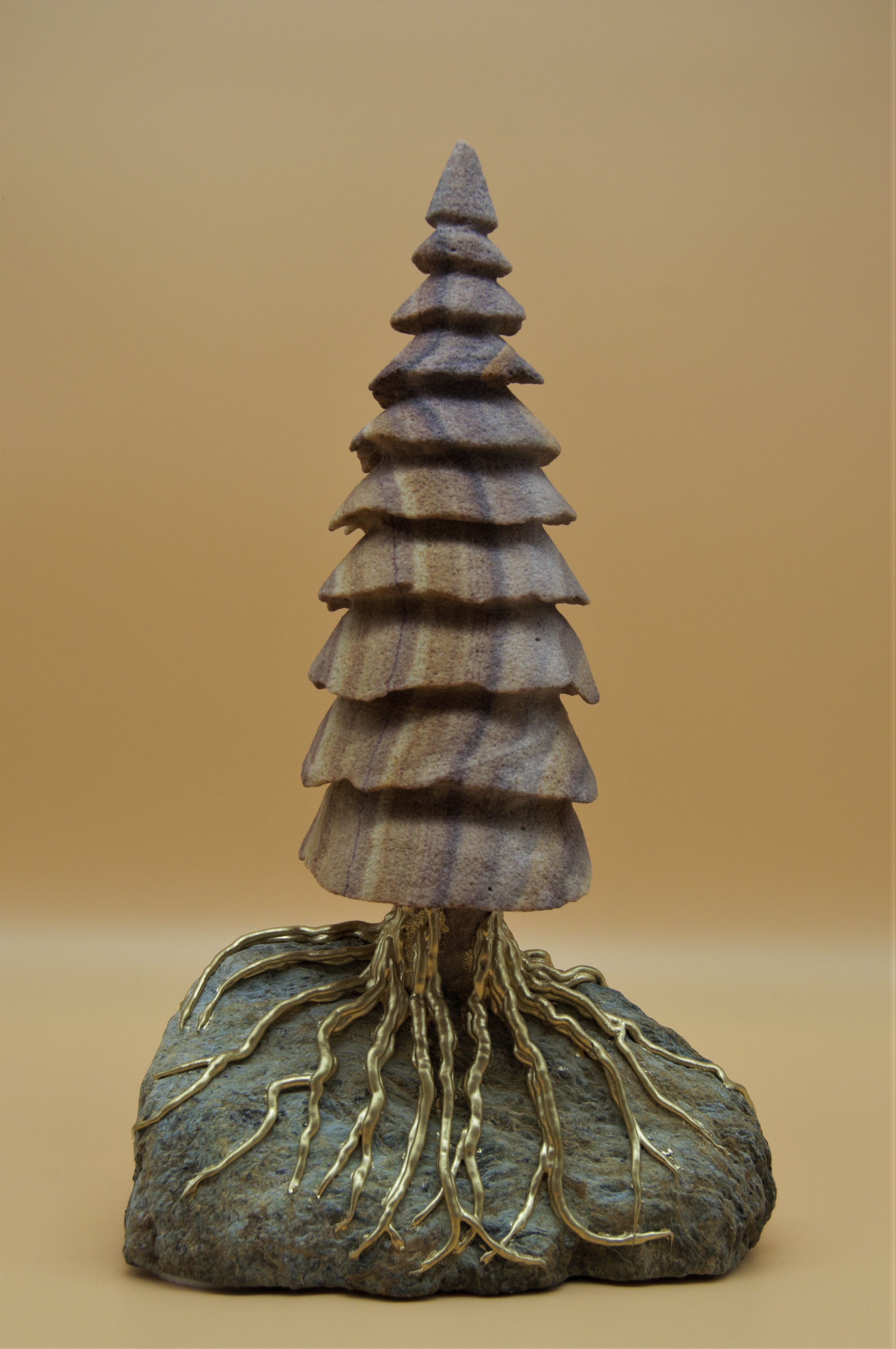 ( Quarzitischer Sandstein ) mit vergoldeten Wurzeln auf Walliser Serpentin. Der Lebensbaum der an der Basis festgewachsen ist und unter keinen Umständen loslässt. Allgäuer Handarbeit, Nummeriert und signiert. Unikat
