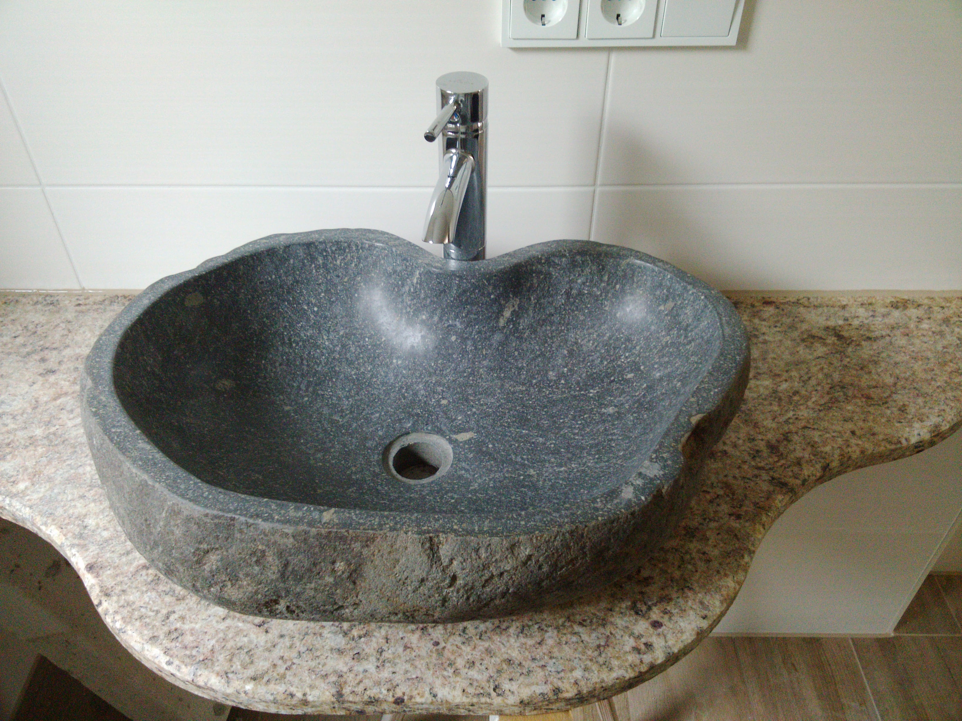 Ein Basaltbecken aus abgerollten Basaltfelsen Vulkanischen Ursprungs von der Indonesischen Insel Java. Dort wo den Menschen nach der Abholzung des Regenwaldes nur noch Steine zum Überleben bleiben. Handwerklich gearbeitet, außen Naturkruste, innen feingeschliffen.
