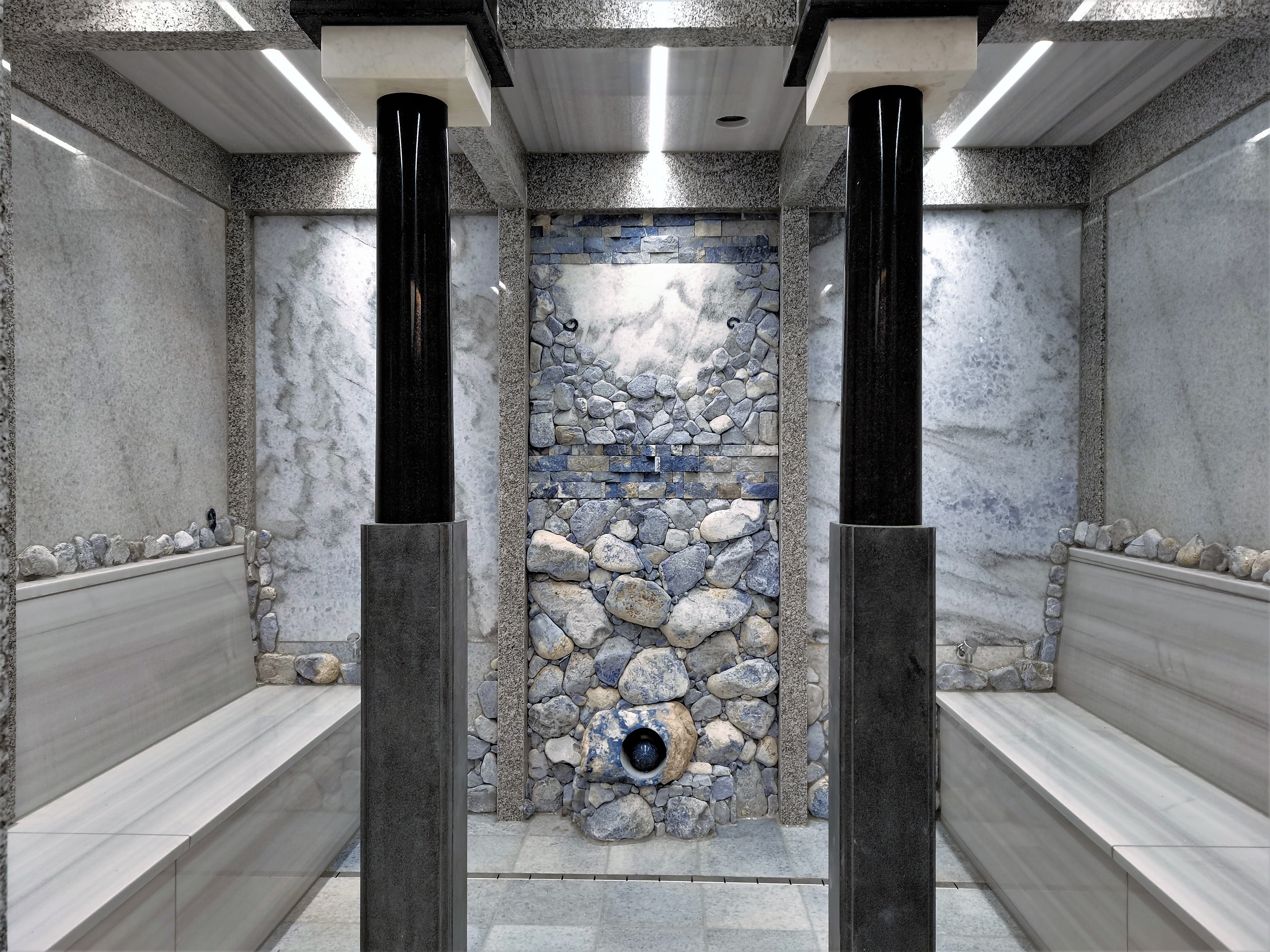 Eine Architektonische Herausforderung ist diese Sauna mit Nachhaltigen Baustoffen auf jeden Fall. Mit Nuten, Überschneidungen und Lastverteilung der massiven Natursteine wie es bereits unsere Vorfahren seit Jahrtausenden in ihren Bauwerken praktizierten, können wir heute von dem zehren was die Erfahrung der Baumeister uns hinterlassen wurde. Stets wurden Natursteine von Bauwerken abgebaut um an anderer Stelle ein neues zu erbauen. Die schwarzen Basalt-Säulen dienten einst einen anderen Zweck, wer weiß was in Jahrzehnten damit noch geschehen wird, wieder ein Bad oder eine Sauna? Die großen einteiligen Wand- und Deckenplatten geben dem nur 9 qm kleinen Raum eine Fülle dem Öffnen wieder, wie es in einem römischen Tempel üblich war.