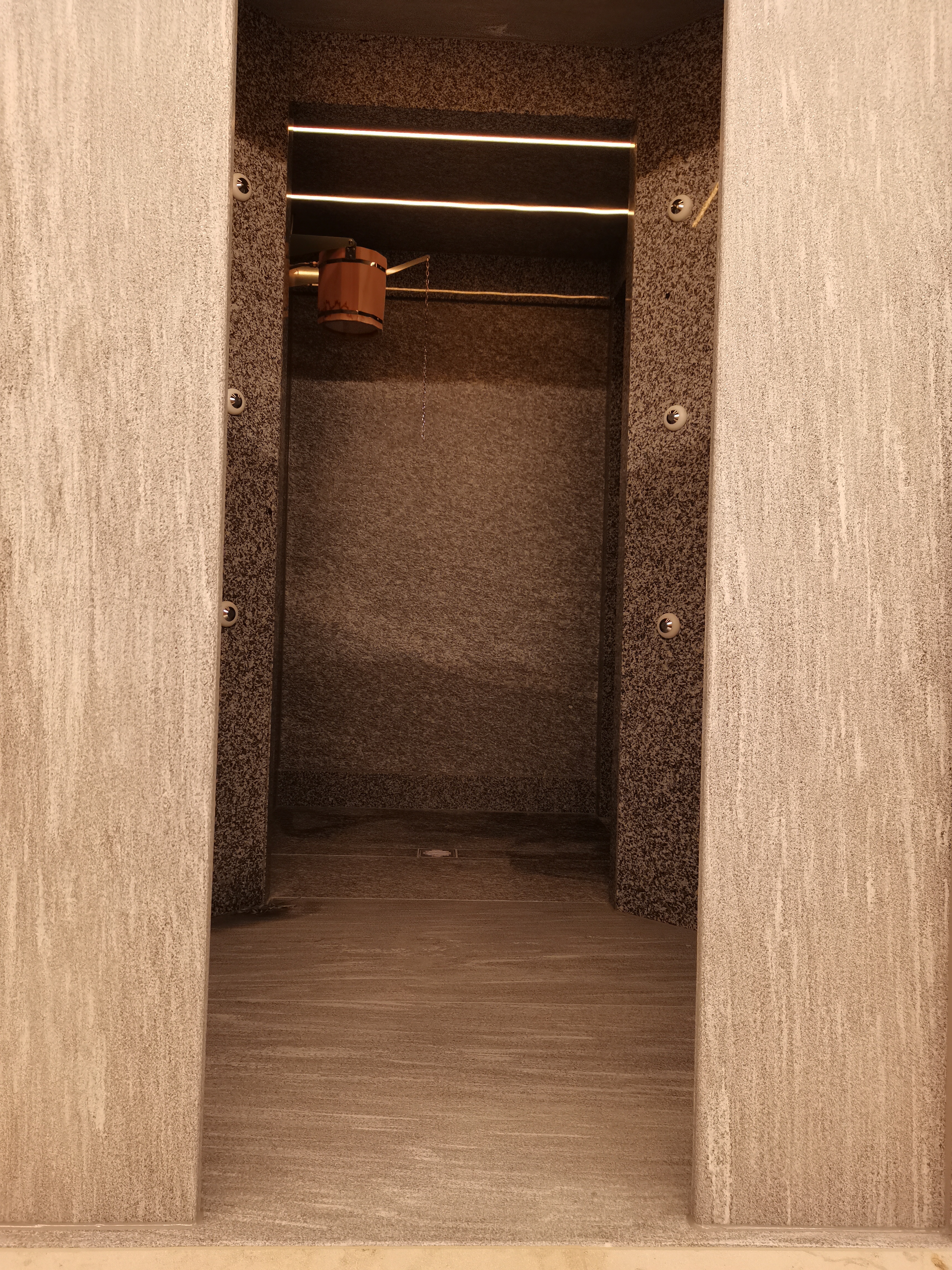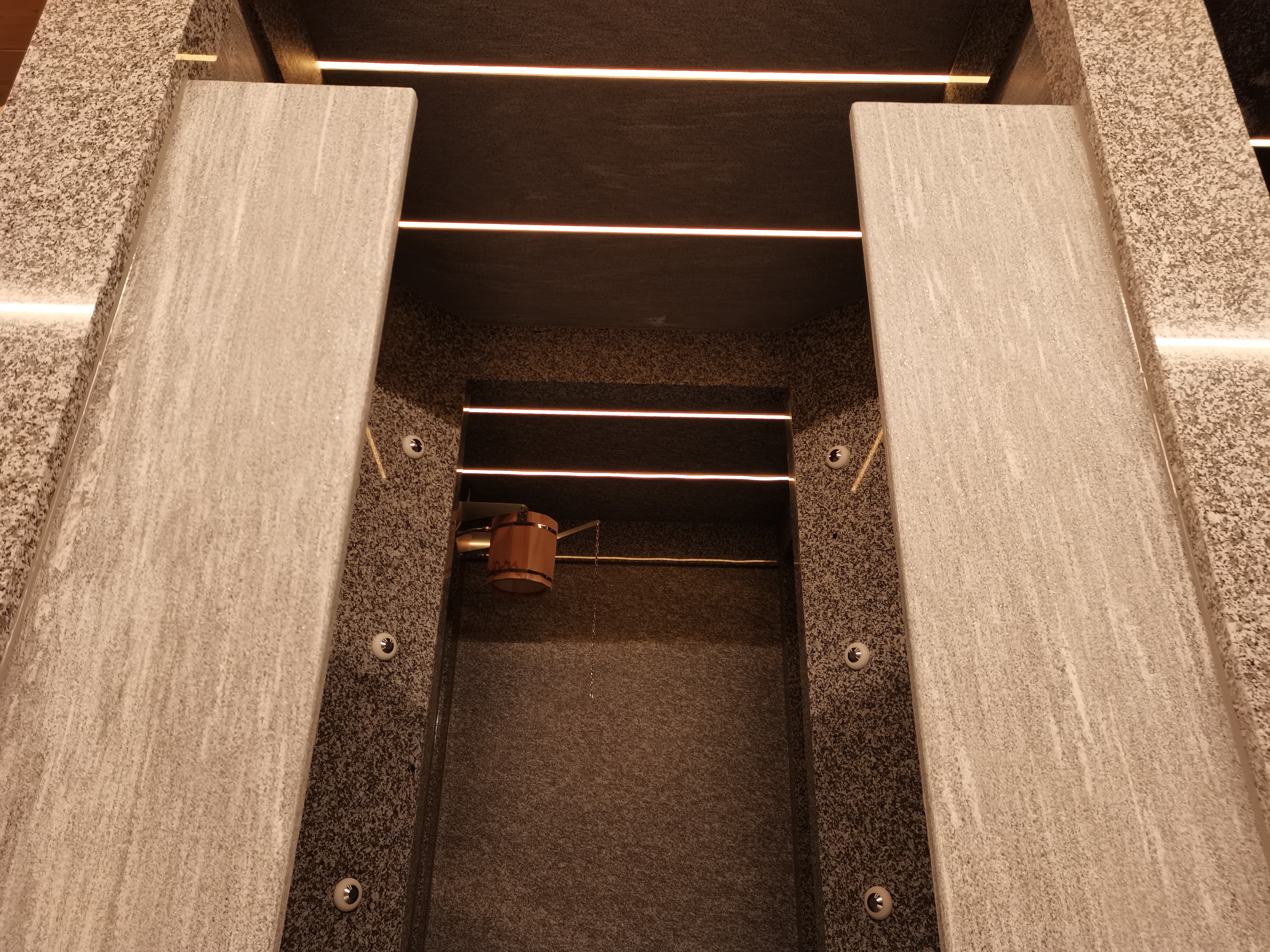 Tessiner Calanca-Gneis mit Düsensäulen aus französischen Tarn-Granit kühlt den Körper vorab, bis es weiter zur Kübel-Schauer-Dusche aus Bianco-Stella-Gneis geht. Integrierte wasserdichte Lichtbänder zwischen den steinernen Deckenplatten geben der Erlebnisdusche ein Gefühl der Wanderung in einem Canyon der Alpen.