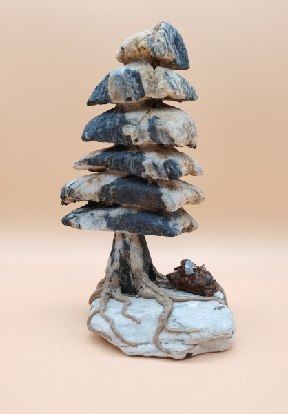 Aus einem harten Metamorphit ( Umwandlungsgestein ) aus dem Binntal / Wallis geschnitten, Basisstein aus Dolomitmarmor mit kleiner Rauchquarz-Stufe. Der Baum als ein Symbol des Wiederstandes gegen äußere negative Einflüsse, der Baum der sich fest verankert am Felsen. Schweizer Handarbeit. Unikat