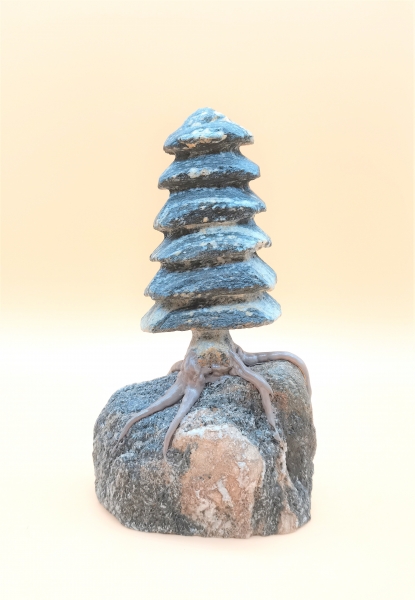 Ein kleiner Baum aus Metagabbro auf einem Granat und Hornblende haltigen Metamorphit. Im Binntal eine Seltenheit über 2000 Meter, dort wachsen kleine Lärchen 200 Meter höher als die Baumgrenze in Felsspalten und unter Überhängen. Schweizer Handarbeit. Unikat