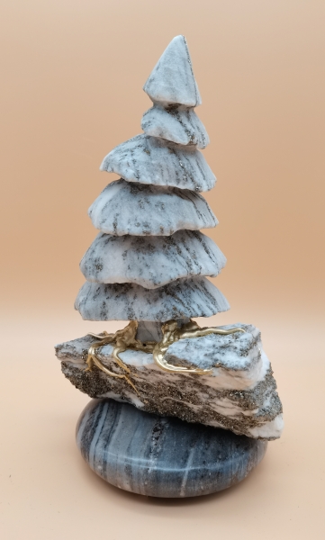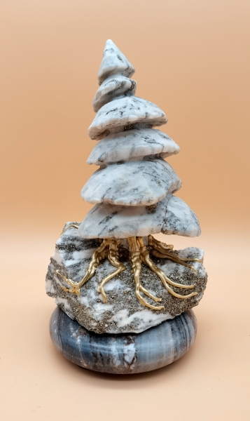 Symbol Lebensbaum, der an seinem Standort verwurzelte Baum auch wenn sich die Scheibe des Lebens dreht. Walliser Goldmarmor Binntree mit M-vergoldeten wurzeln auf Palisandro-Dolomit aus dem Piemont/Italien. Schweizer Handarbeit. Unikat