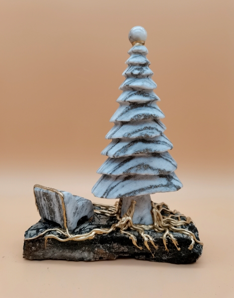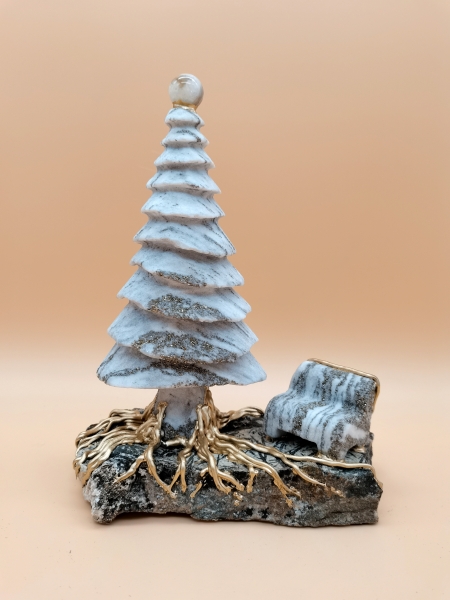 Der Ursprung der Gemütlichkeit kommt aus Bäumen und Steinen. Symbole bereichern unser Leben auf diesem so verletzlichen blauen Planeten mit ihren Wäldern, Flüssen und Meeren. Orte des Ausruhens sind selten geworden, umso wichtiger werden Symbole der Eintracht mit Mensch und Natur. Walliser Goldmarmor Binntree, Achatperle, M-vergoldete Wurzeln auf Binntaler Hornblende-Granatschiefer. Schweizer Handarbeit, Nummeriert und signiert. Unikat