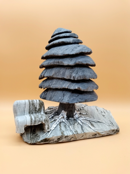 In seltenen Fällen kommt eine feine harte dunkle Dolomit-Marmorader im Binntal ans Tageslicht. Das mit Grafit gefärbte Gestein hat die gleichen Bestandteile wie der Weiße Dolomit-Marmor, darum ist es mir immer eine Ehre dieses schöne Material zu bearbeiten. Etwas Beständiges daraus zu kreieren, etwas zum Nachdenken, wie diesen Baum. Herstellung Bildhauer P.Fraefel, signiert. Unikat