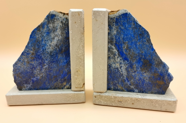 Fein verteilter Pyrit in blauer Matrix zeichnet dieses schöne Exponat aus. Beiger Kalkstein aus dem Altmühltal bildet einen leichten Kontrast zu dem Blau des Lapis. Hergestellt in Bad Wörishofen. Unikat
