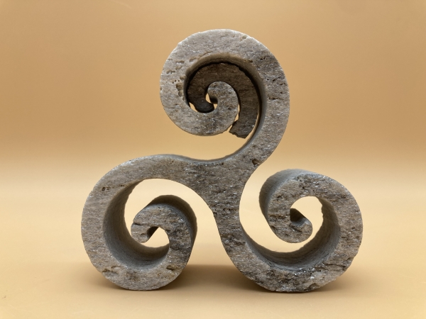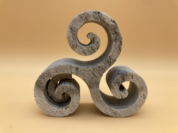 Keltische Triskele aus Binntaler Quarzit mit Ausschnittstück vom Massivteil. Dadurch wurden die unterschiedliche Schichtung und Härte des Gesteins sichtbar. Der Wasserstrahlschnitt wird durch die schräg zur Schichtung stehende Quarzeinlagerung abgelenkt, sodass ein Teilstück des Ausschnitts mit der Triskele verbunden bleibt. Hergestellt in Bad Wörishofen. Unikat