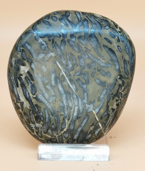 Auskristallisierte Fraßgänge von Holzbohrwürmer im Kalkstein. Vom einstigen Holz ist nichts mehr übrig, da das restliche Holz sich schneller im Morast auflöste als die Fraßgänge der Würmer. Glaziales Geschiebe. Fundort: Kiesiger Waldweg bei Mindelheim / Unterallgäu. Oberfläche geschliffen und poliert. Unikat