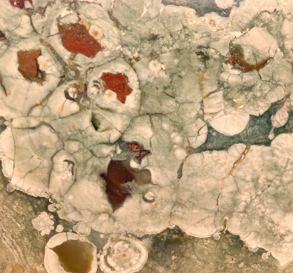 Fließstruktur von Rhyolith in der Entstehung. Im Band gut zu sehen, die knollige Grundform mit dem Aufbruch und Neuverschmelzung. Teils rote glasige Knollenfüllung. Fundort: Mount Hay, Region Rockhampton, Queensland Australien. Unikat