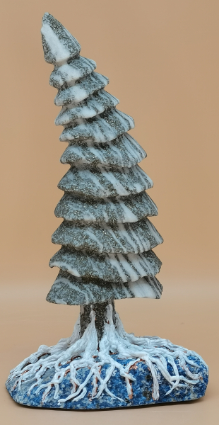 Charakteristisch für den Walliser Goldmarmor sind seine Pyrit-Schichten die in selten Fällen stärkere Bänderungen durch den Dolomit ziehen. Dieser, der per Handarbeit aus dem Felsen geschnittene Baum ist der dortigen Fauna nachempfunden. Bäume die sich mit hunderten Wurzeln am Fels festklammern und in den Ritzen nach Halt und Nährstoffe aus den verwitterten Gesteinen und Pflanzenresten suchen. Handarbeit aus Schweizer Hand. Unikat