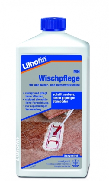 Lithofin MN Wischpflege eignet sich zur dauernden Verwendung auf allen Arten von Steinbelägen. Reinigt und pflegt beim Wischen, steigert die natürliche Farbwirkung. Sowohl bruchraue, geschliffene wie auch polierte Flächen werden bei regelmäßigem Gebrauch zunehmend schöner und satter in Farbe und Struktur. Ideal für imprägnierte oder versiegelte Flächen. - Konzentrat - sehr ergiebig - nicht schichtbildend - nicht auslaugend - wachsfrei Dosierung: ca. 20 ml pro 10-L-Eimer Wasser Gebinde: 1 Liter
