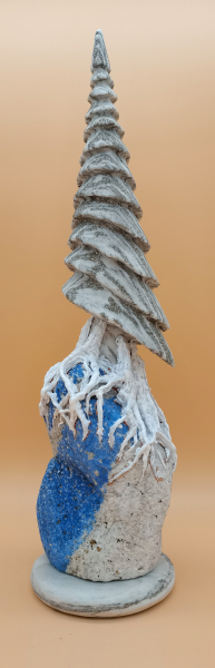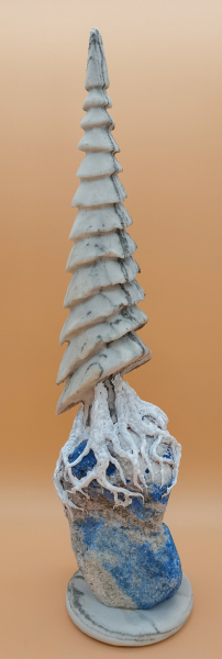 Wer einmal schon die Tempel in Angkor Wat gesehen hat, versteht diese Plastik. Wenn sich flüssiges Holz über Mauern und Steine ergießt, Wald, die Errungenschaften der einstigen Bewohner zurückerobert hat, dort haben die Bäume die Fugen der Mauern gesprengt. Die Steine im Schatten der Baumriesen zur Insel für allerlei Getier und Moose zu neuem Leben fanden. Walliser Goldmarmor auf Ultramarin-Lapis, Steinbildhauer Peter Fraefel Bad Wörishofen. Unikat
